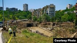 Затопленная 13 июня дорога, идущая от бассейна «Лагуна Вере» до автостоянки на улице Элбакидзе, была также вымощена стройматериалами из церкви Святого Николая, говорит Серго Вардосанидзе.
