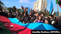 Шаин Рзаев: Одним из лозунгов было: «Свободу политическим заключенным». Сейчас у нас очень много заключенных, именно связанных с религией, их условно называют «исламистами». Это ярлык, на самом деле, но именно по поводу своей религиозной ориентации, «нардаранское дело», Тале Багирзаде и т.д. – и у них очень много сторонников. Эта женщина была одной из их сторонниц, наверное, она пришла, думала, что хорошее дело, но сами организаторы митинга попросили ее не давать повода, и она убрала этот плакат. Я думаю, что на самом деле реальная оппозиция в Азербайджане сейчас не те, кто выходит на разрешенные, санкционированные митинги, а реальная оппозиция, к сожалению, сейчас сидит в мечетях и ждет своего часа, и это немного тревожно для меня как гражданина Азербайджана.