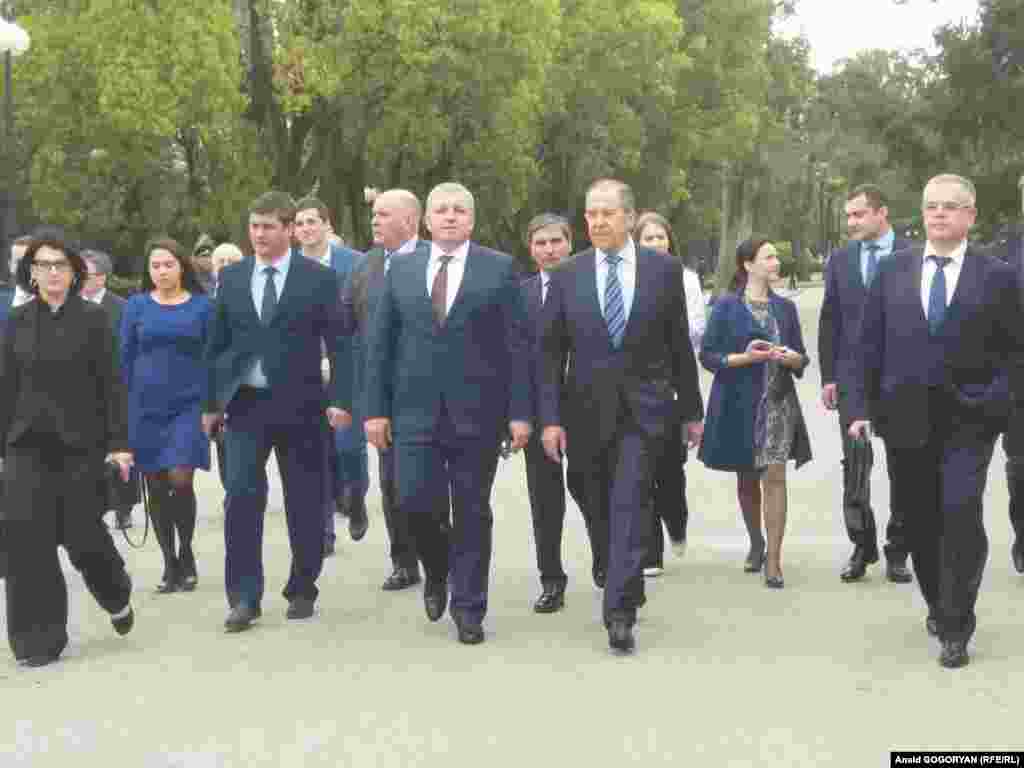 Сергей Лавров в сопровождении премьер-министра Беслана Барциц, министра иностранных дел Даура Кове и других чиновников