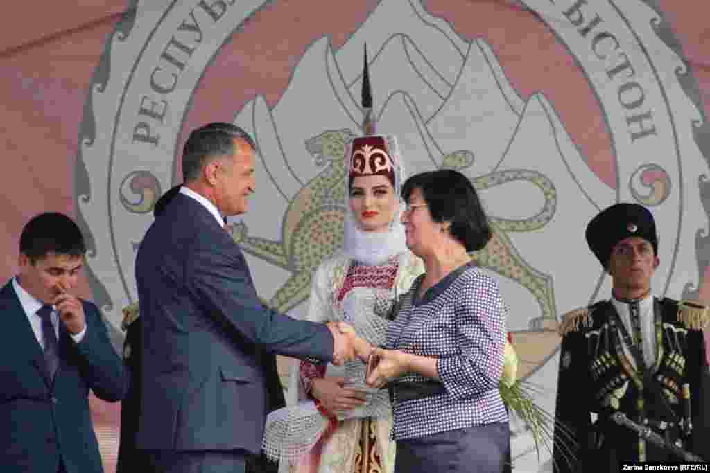 Инаугурацию посетил абхазский премьер Беслан Барциц, чуть позади экс-президент, главный инфомейкер югоосетинских выборов - Эдуард Кокойты