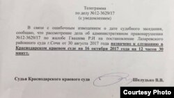 Сегодня в социальных сетях появилась фотокопия телеграммы с уведомлением Краснодарского краевого суда за подписью судьи В.В. Шелудько о том, что рассмотрение дела Руслана Гвашева переносится с 5 октября на 16 октября по той причине, что на пятое число слушание было назначено по ошибке.