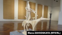 В двух залах разместились два десятка панно из войлока и десяток панно из рогоза, пять больших золотистых циновок, занимающих почти всю стену, деревянная и бронзовая скульптура и семнадцать двухметровых посохов-жезлов.