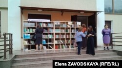 У библиотечного стенда с книгами, которые можно забрать с собой, было много взрослых и молодежи, и книги с полок быстро исчезали.