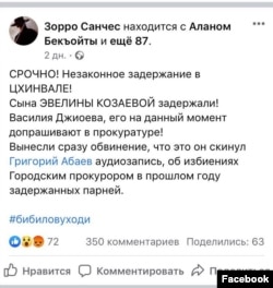 «Срочно! Незаконное задержание в Цхинвале! Сына Эвелины Козаевой задержали! Василия Джиоева, его на данный момент допрашивают в прокуратуре! Вынесли сразу обвинение, что это он скинул Григорию Абаеву аудиозапись об избиениях городским прокурором в прошлом году задержанных парней».