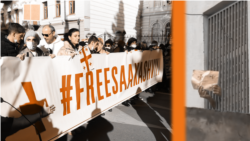 «Да, мы собрались сегодня все здесь, чтобы поздравить Михаила Саакашвили с днем рождения и сказать всему миру: Михаил Саакашвили должен быть освобожден! Грузия должна быть освобождена из клешней олигарха, и главное, чтобы раз и навсегда в этой стране политическое правосудие не преследовало людей!»