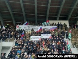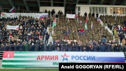 На сухумском стадионе «Динамо» прошел митинг, участники которого, по информации организаторов, выступили в поддержку «действий Российской Федерации по обеспечению мира и порядка на территории «ДНР» и «ЛНР», а также денацификации и демилитаризации Украины».