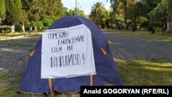 Сегодня третьи сутки голодовки общественного активиста Джансуха Адлейба на главной сухумской площади – Свободы. Тут же, при входе в примыкающий к площади сквер стоит палатка, в которой он ночует. Днем он сидит на садовой скамейке и общается с друзьями и единомышленниками, которые его навещают. А еще собирает подписи граждан Абхазии, выступающих за снижение цен на ГСМ в республике. Ведь Адлейба объявил голодовку, требуя от правительства возвращения цен на топливо к показателям годичной давности.