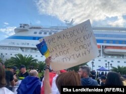 Собравшиеся в Батуми участники акции скандировали «Русский корабль, иди на ***», «Путин – х**ло» и «Абхазия – это Грузия».