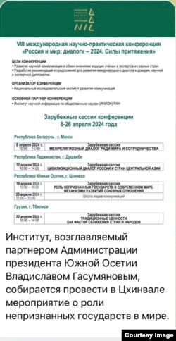 Телеграм-канал «Осетия» обсуждает проведение в Цхинвале 19 апреля научно-практической конференции на тему «Роль непризнанных государств в современном мире. Механизмы развития союзнических отношений». Авторы публикации обращают внимание, что Национальный исследовательский институт развития коммуникаций, возглавляемый Владиславом Гасумяновым, 22 апреля проведет подобную конференцию и в Тбилиси. Там тема анонсирована следующая: «Традиционные ценности как фактор сближения стран и народов».