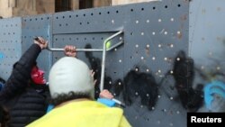 Ранее участники митинга повредили защитный железный барьер, установленный у здания парламента.