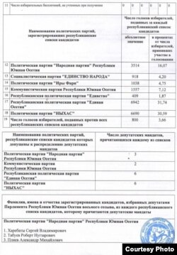 В результате из-за 1 795 неучтенных испорченных бюллетеней (по данным ЦИК) количество проголосовавших уменьшилось с 23 663 до 21 868. За счет этого результаты партий немного выросли – буквально на доли процента. Для коммунистов, набравших по официальным данным 7,01%, этого достаточно, чтобы лишиться единственного мандата по пропорциональным спискам. По заявлению избирательного штаба «Единой Осетии», при правильном подсчете коммунисты должны получить 6,5% голосов – то есть они не проходят в парламент. Соответственно, настаивают избирательные штабы «Народной партии» и «Единой Осетии», эти два мандата должны быть распределены между ними, если подводить итоги голосования в соответствии с законом. По их подсчетам, «народники» должны получить четыре, а «единоосы» – семь мандатов по пропорциональным спискам.