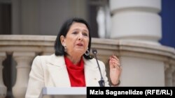 Завершив свою речь, Саломе Зурабишвили вышла к собравшимся через центральные ворота под скандирование «Спасибо!», чтобы пожать всем руки и поблагодарить за поддержку.