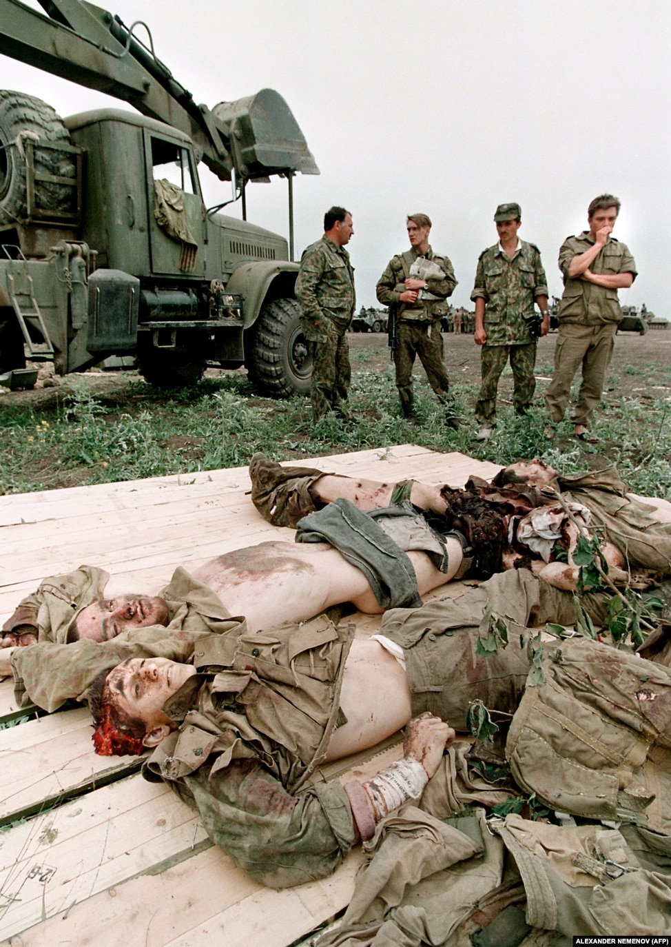 Военнослужащие "спецназа" осматривают тела чеченских боевиков, погибших при защите села Бамут на западе Чечни. Село перестало существовать, так как не осталось ни одного целого строения после жестоких бомбежек, а его жителям было запрещено возвращаться и строиться. Май 1996 года.