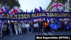 За шесть дней до парламентских выборов в Тбилиси проходит масштабная акция «Грузия выбирает Евросоюз». Сторонники европейского курса страны собрались на пяти локациях и двинулись маршем к площади Свободы, где большой проевропейский митинг начался с исполнения гимнов Грузии и ЕС.