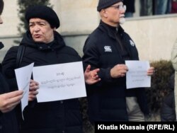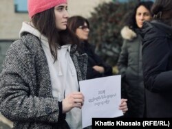 Нана Гахария держит большой баннер. На нем последний жест Замира Квеквескири, охваченного пламенем. И надпись: «Это последнее послание Замира Квеквескири».